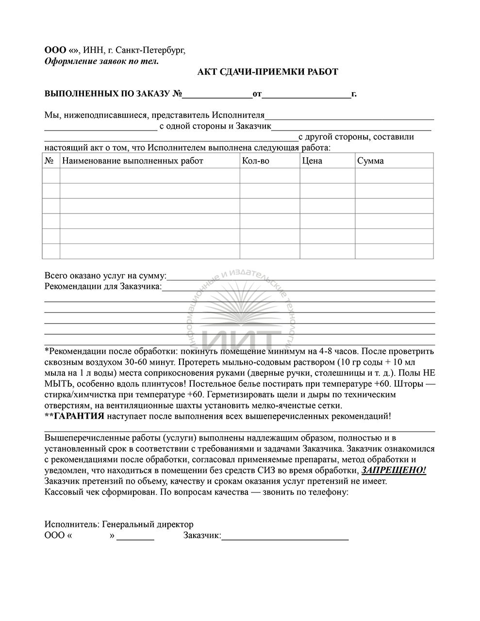 Акт печатается на высококачественной самокопирующейся немецкой бумаге плотностью 60 гр/м2, поставляется блоками по 25 экз. Наша типография обеспечивает доставку актов санобработки в любой город России.