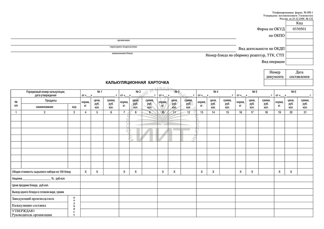 Бланки калькуляции стоимости пищевых продуктов для предприятий общественного питания.