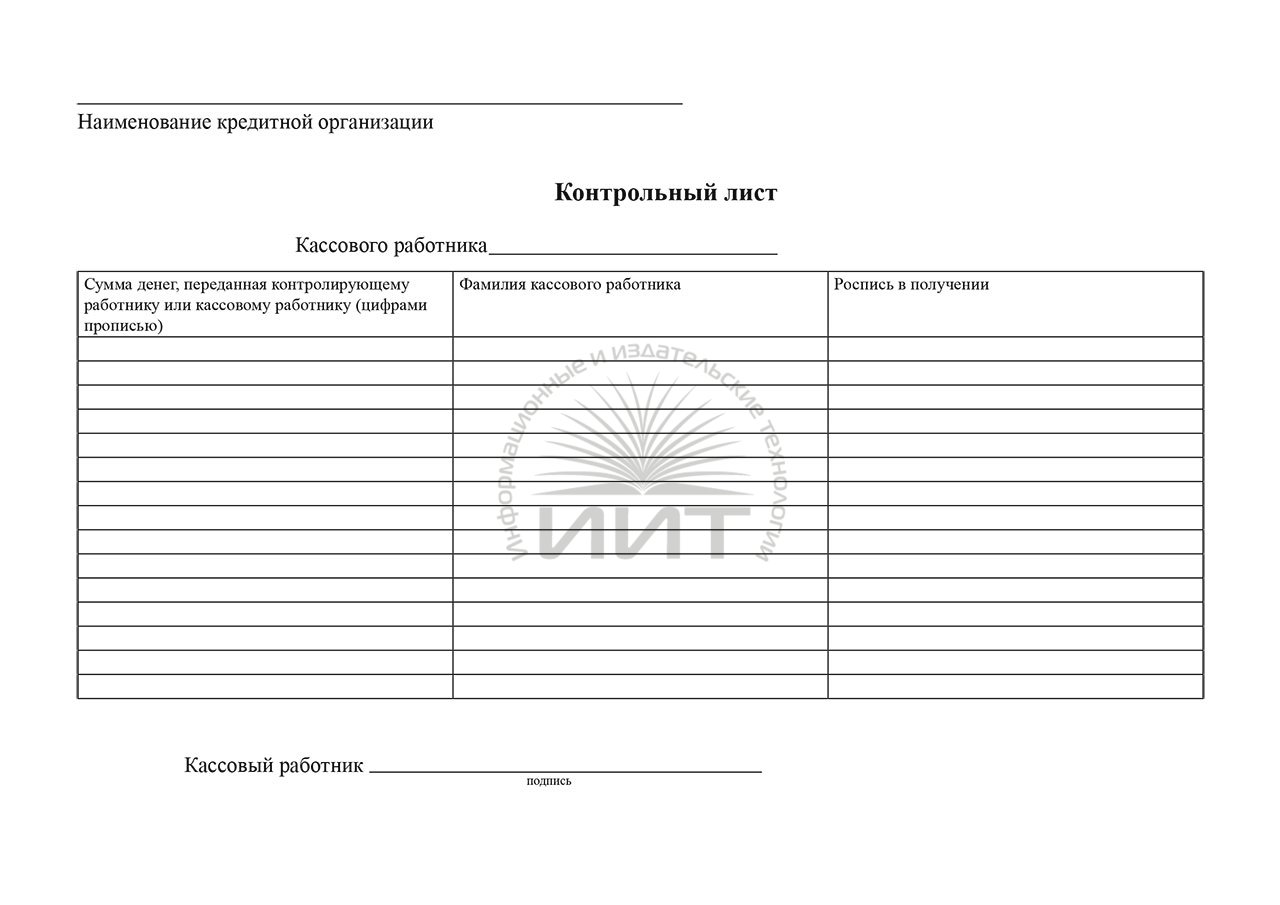 Бланки контрольного листа кассового работника печатаются на бумаге плотностью 80 гр/м2 и склеиваются в блоки по 50 экз. Наша компания осуществляет доставку готовой продукции по всей стране.