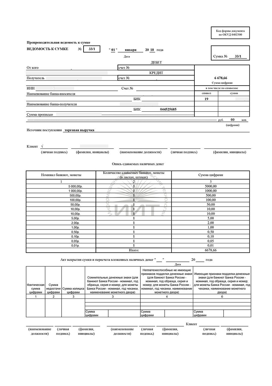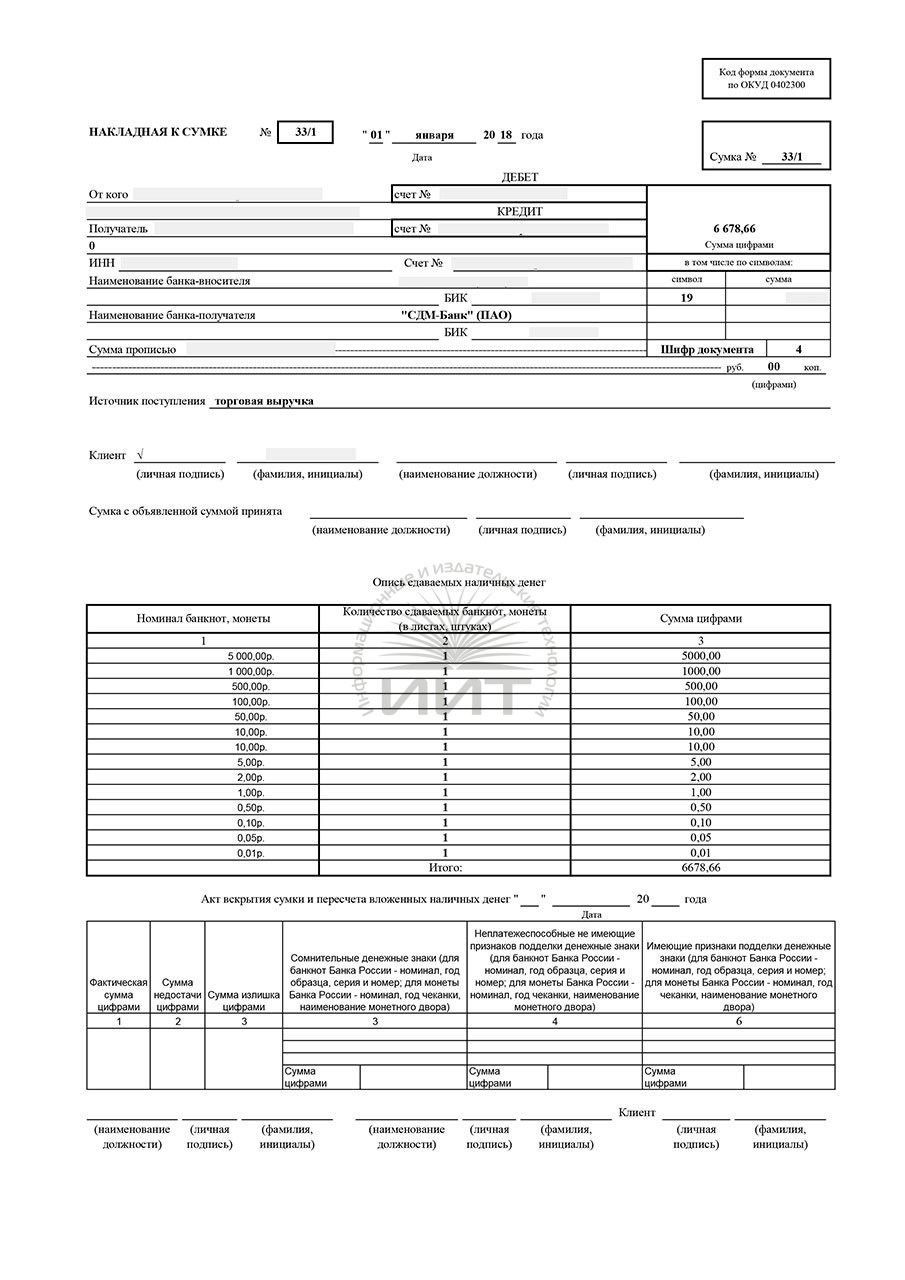 В каждом документе присутствуют реквизиты банка-вносителя и банка-получателя. Накладные, ведомости и квитанции к сумкам с наличностью печатаются на высококачественной мелованной бумаге плотностью 80 гр/м2 и склеиваются в блоки по 50 листов.