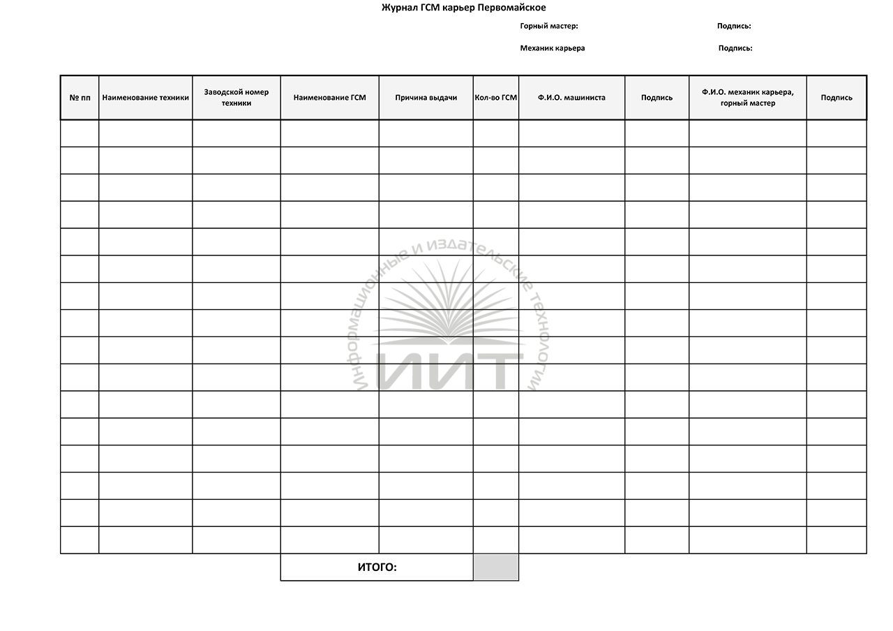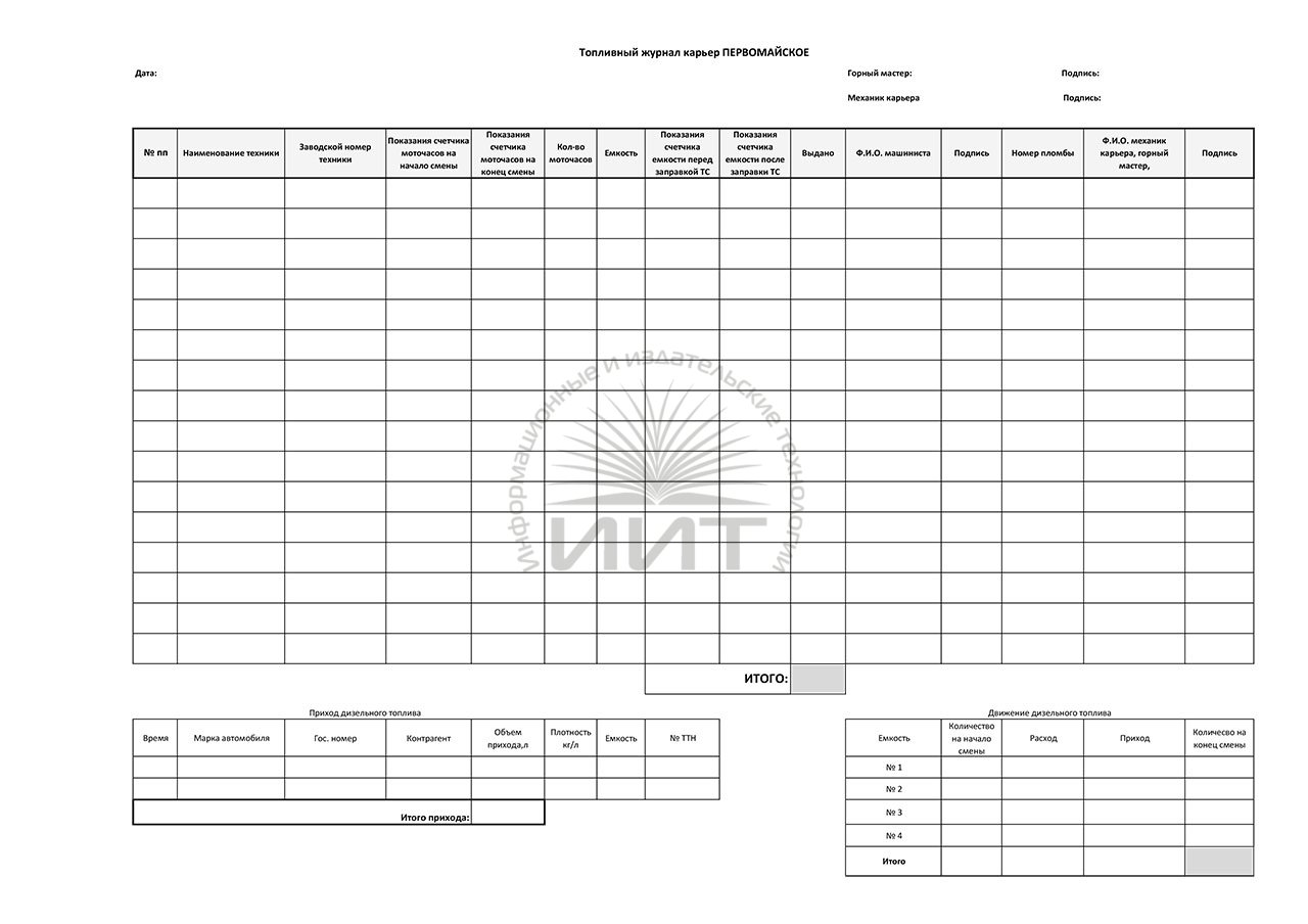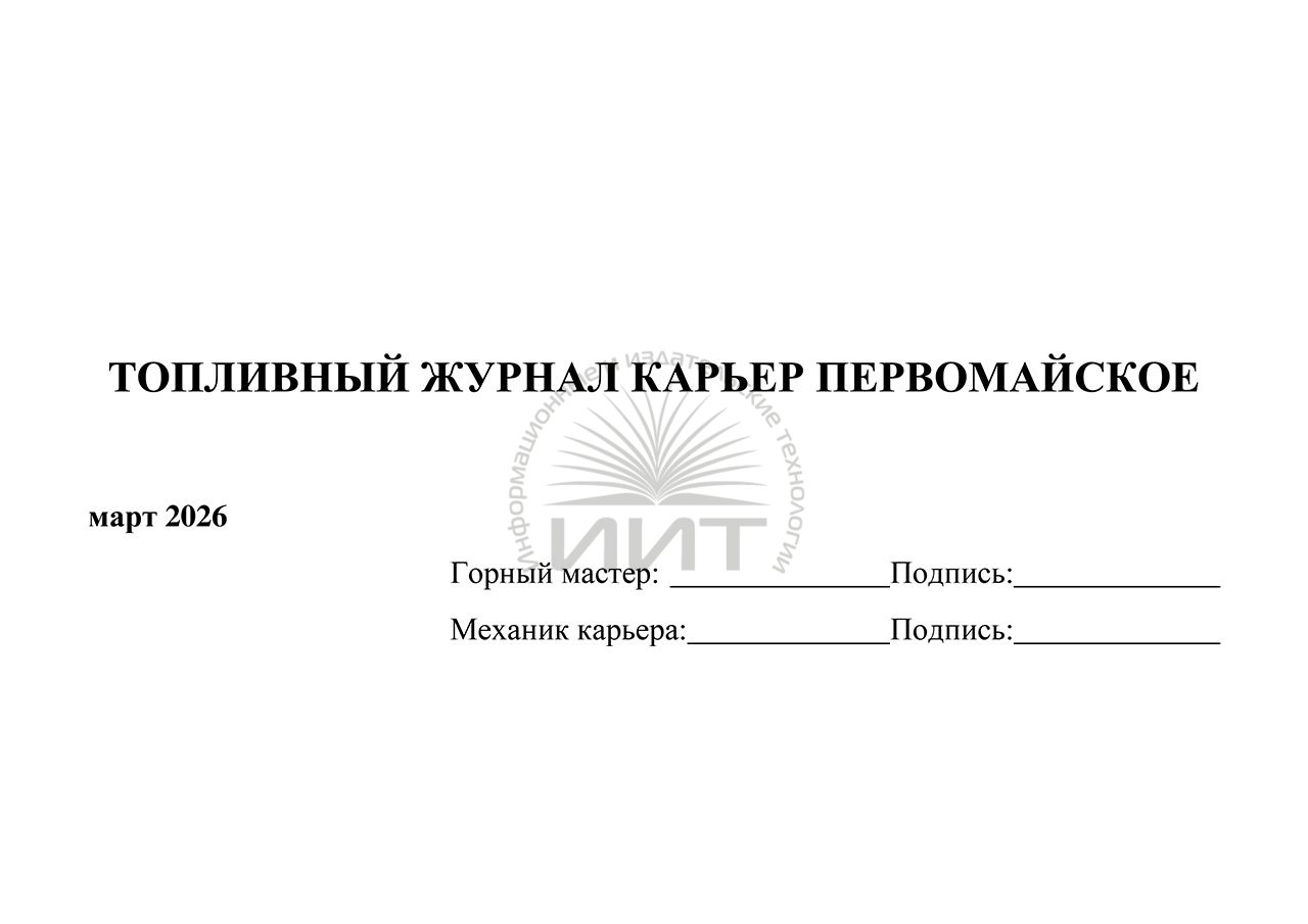 Топливный журнал фиксирует количество ГСМ, выданных для работы карьерной техники и показания счетчика топлива на конец смены. Журнал визируется машинистом и горным мастером (механиком карьера).