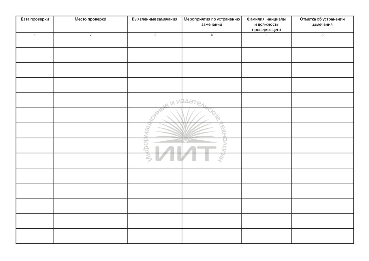 Журнал проверки рабочих мест включает графы даты и места проверки, выявленных замечаний, мероприятий по их устранению, Ф.И.О. проверяющего и отметки об устранении замечаний. Журнал печатается на высококачественной мелованной бумаге плотностью 80 гр/м2, количество листов — 50.