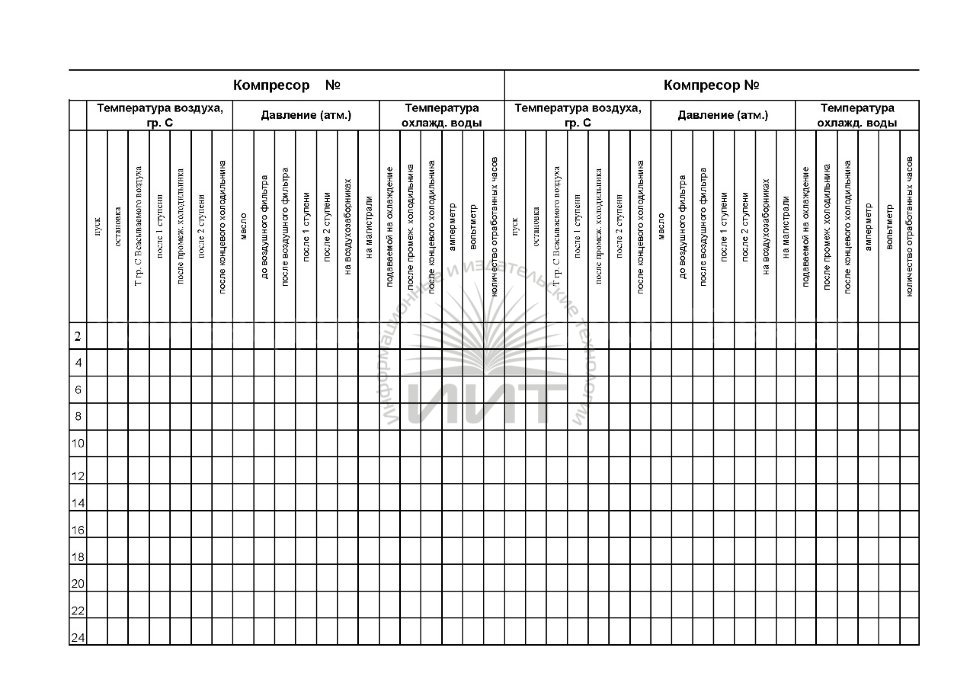 В сменном журнале работы компрессорного цеха записываются данные о температуре воздуха в компрессорах, давлении, температуре охлаждаемой воды. Журнал печатается на мелованной бумаге. По запросу заказчика в форму журнала могут быть внесены изменения.