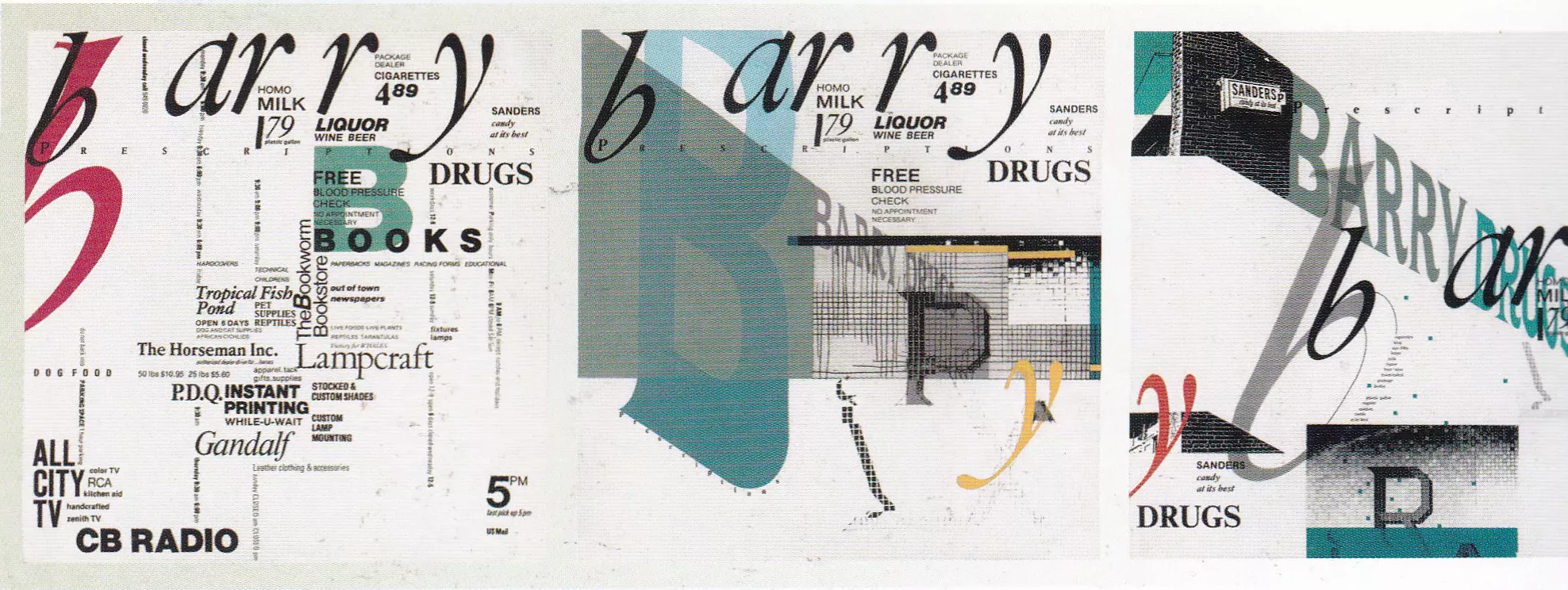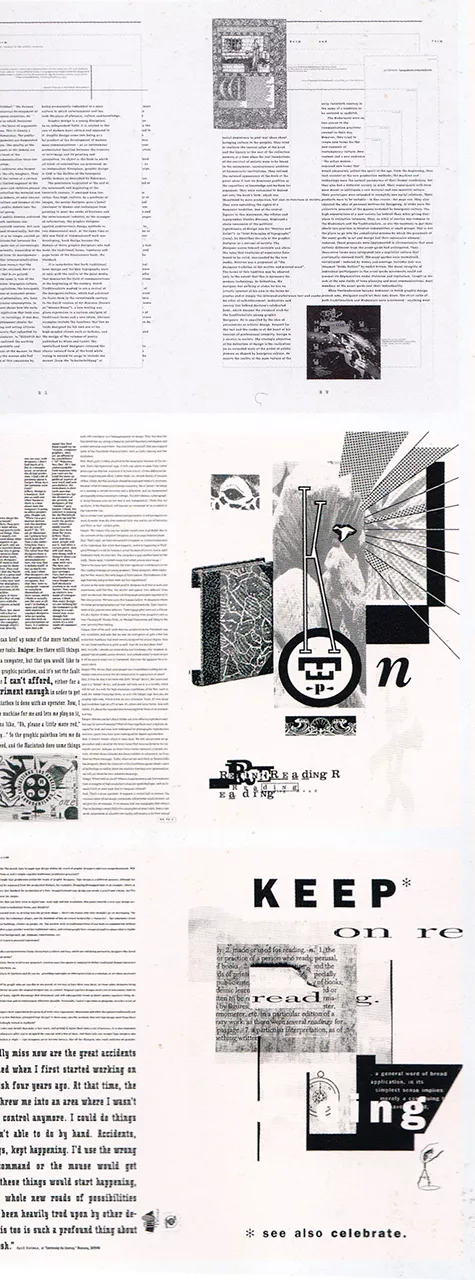 Обрезки материалов (таких как ламинат и засвеченная фотопленка) и символы поп-культуры аранжируются в композициях, отвергающих любые сетки и «правильные» пропорции. Произведения создавались из разорванных, коллажированных и обезличенных изображений, часто использовались шрифты пишущих машинок и вырезанные буквы из журналов (причем буквы были разных шрифтов и размеров, что в теории дизайна считается недопустимым). Эти фрагменты, как знаки у Деррида, находятся в постоянном сопоставлении, зачастую не поддаются никакой визуальной иерархии и не иллюстрируют никакого содержания (см. рис. 13). Эти работы созданы из свободно плавающих означающих, окончательный смысл которых постоянно откладывается, что в корне противоречит логике модернистских работ. Также стоит отметить, что работы выпускников этих академий были чистым искусством, не предназначенным для заказчиков. 80-е и 90-е годы — это период, когда молодые дизайнеры открывали и строили свою новую теорию. Читатель пишет текст На графический дизайн 1980-х огромное влияние оказал Ролан Барт.