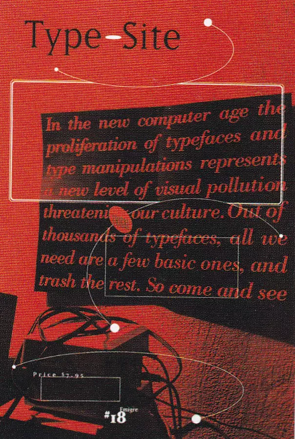 Тот, кого не страшат новые постмодернистские типографские технологии, используют их всеми доступными способами как возможность изобрести заново эстетику шрифта в ответ на сами технологии. Незнакомые доселе типографские формы производятся в ответ на главные изменения в технологиях и часто классифицируются как доказательство преступления против эстетики, размытия стандартов и кустарщины. Функциональный модернистсткий импульс — подчинить эстетику требованиям машины. Но в этом случае, субъект технологии дематериализуется, становится бесконечно заменяемым. В результате, эстетика отражает качества, которые ставят в тупик модернистов.