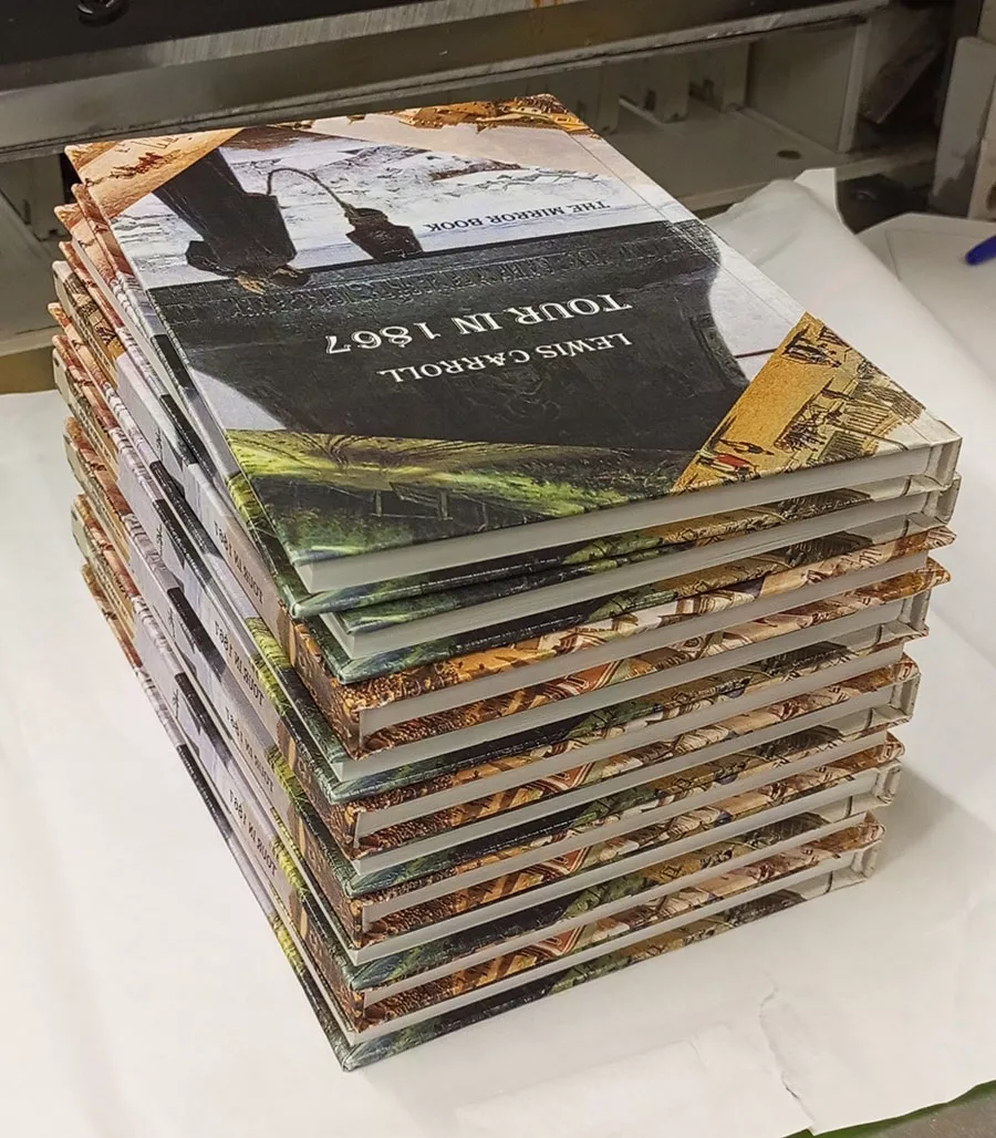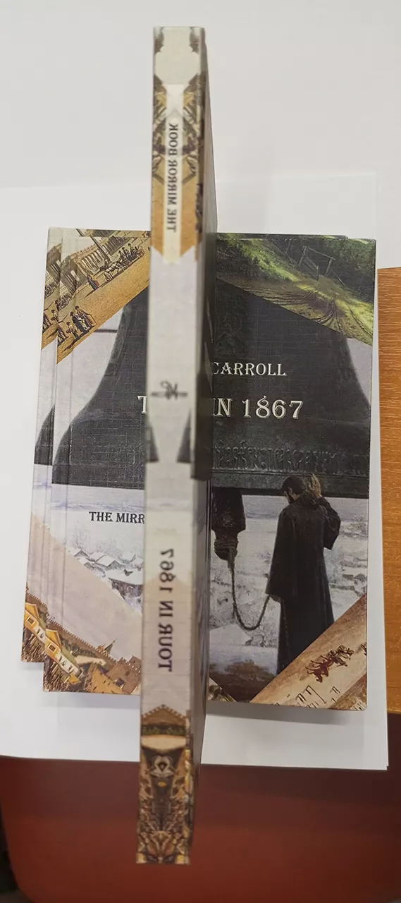 В ноябре 2024 г. мы по заказу «Зеркального издательства» напечатали книгу Льюиса Кэрролла «Tour in 1867». В книге собраны дневники писателя, которые он вел во время путешествия в Россию. С теплом и английской иронией Кэрролл описывает европейские и российские города, порядки и встречающихся ему людей самых разных профессий и сословий.
