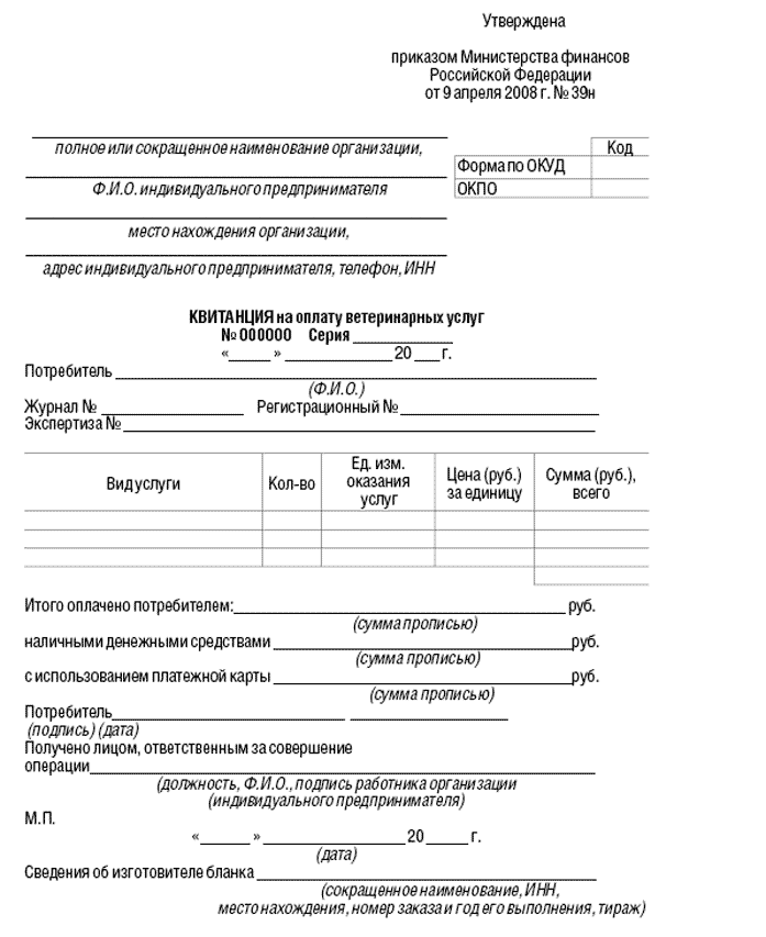 Об утверждении формы бланка строгой отчетности «Квитанция на оплату ветеринарных услуг»